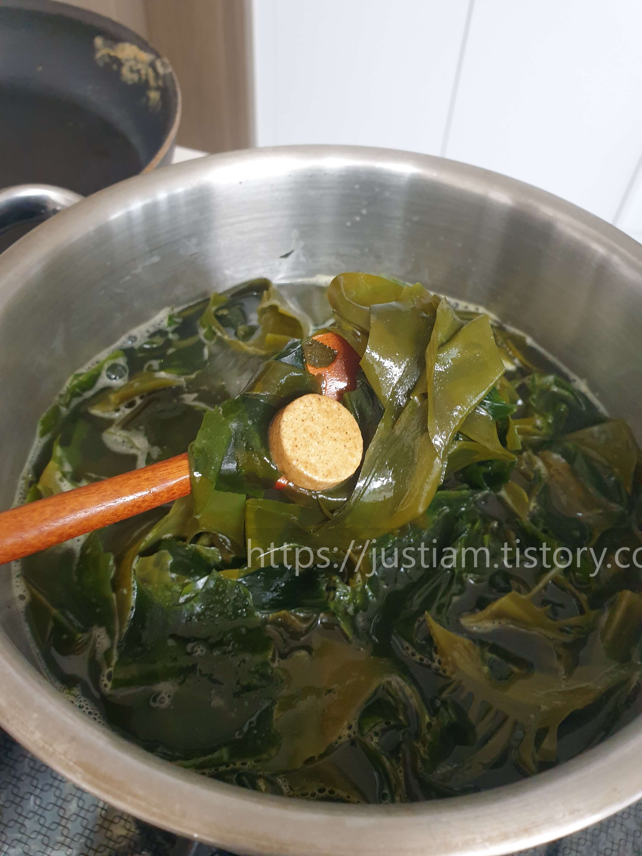 요즘엔 멸치육수 대신에 육수 한 알을 넣기도합니다. 미역국은 오래 끓인게 맛있기 때문에 요리시간이 부족할 때 육수한알을 넣으면 조미료를 넣은 맛이 나요. 맛있다는 이야기지요.