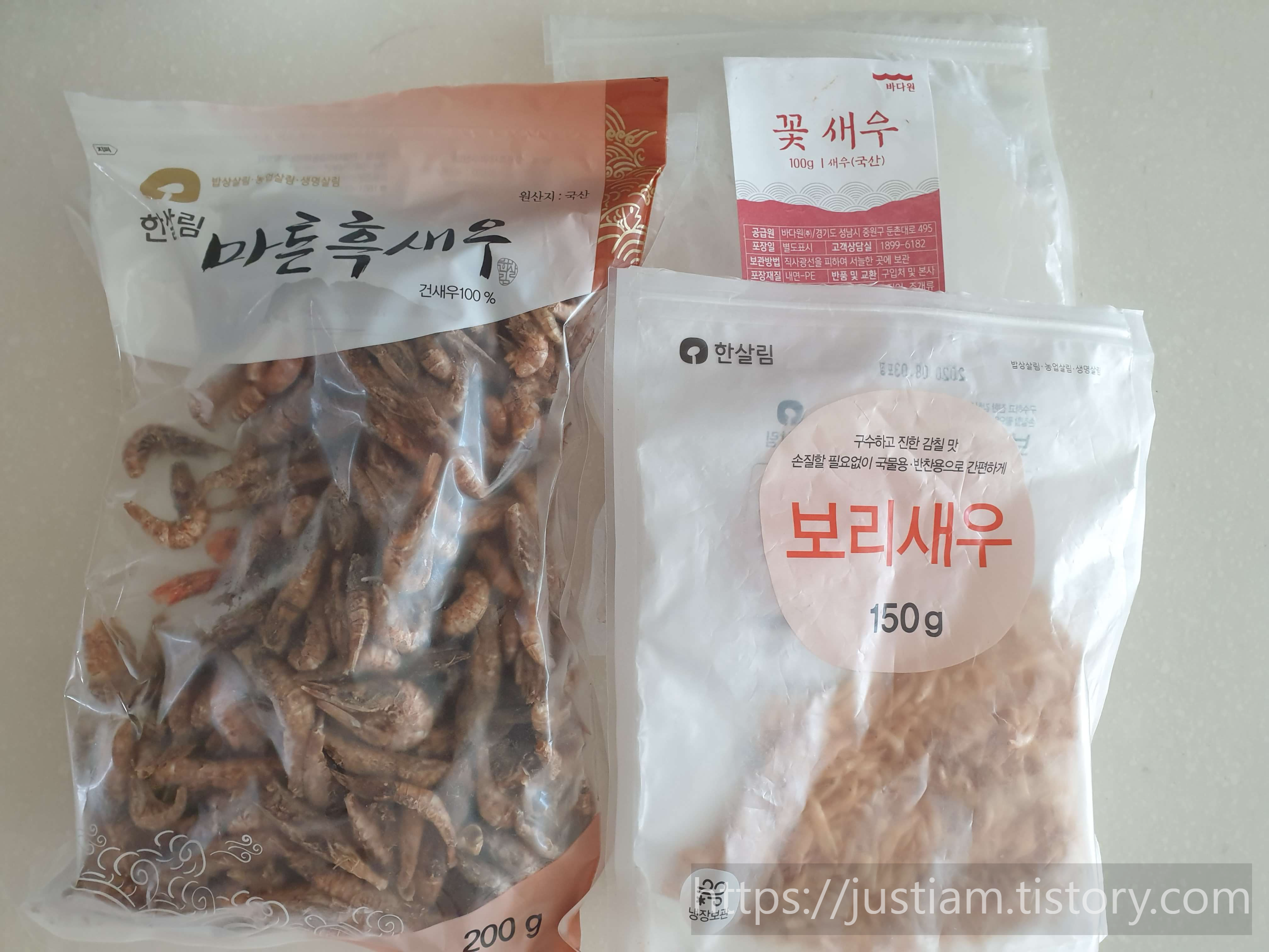 저는 두절 건새우도 꽃새우와 같은 용도로 사용합니다. 두절 건새우가 약간 더 딱딱하고 큽니다. 두절 건새우 사진이 없어서 그렇지 두절 건새우도 잘 사용하고 있습니다.